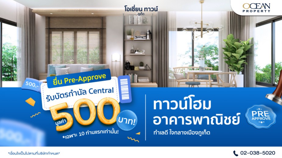 Simply submit a Pre-Approve loan application for purchasing a townhome or commercial building at Ocean Town - Phuket and receive a 500 Baht Central Gift Voucher for free! Limited to the first 20 applicants valid today through 31 August 2026 only..  >> Click here